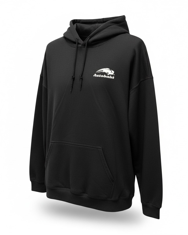 Adult Autobahn thicker black hoodie with white Autobahn logo on upper left side and full track layout on the back.